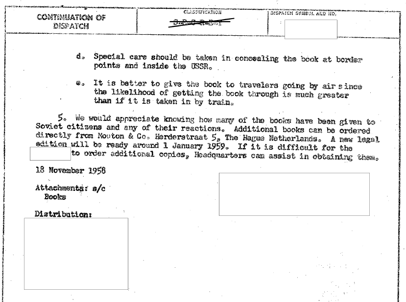 a miniature copy of Zhivago in Russian produced by the CIA and covertly distributed behind the Iron Curtain;